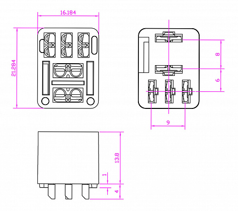 Колодка реле под пайку в плату КРмП5 (3шт.-4,8мм; 2шт.-6,3мм)