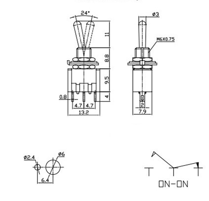 Тумблер MTS-102 является двухпозиционным. MTS-102 предназначен для коммутации цепей переменного тока напряжением до 250В с током не более 3А. Тумблер имеет 3 вывода в виде контактов, предназначенных под пайку.