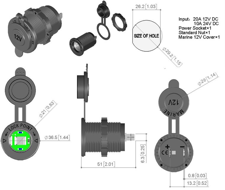 Разъем прикуривателя SF50780-1W 12V/20A 24V/10A с белой подсветкой