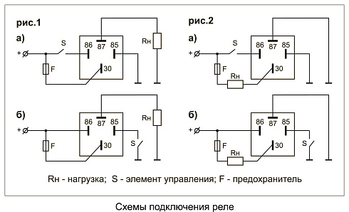 При подключении допускается менять между собой контакты “85” и “86”. Управление может осуществляться как “плюсом” (рис.1а, 2а), так и “минусом” (рис.1б, 2б).