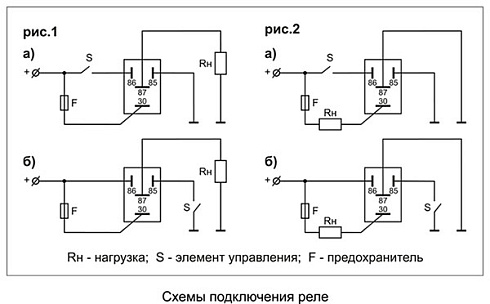 При подключении допускается менять между собой контакты “85” и “86”. Управление может осуществляться как “плюсом” (рис.1а, 2а), так и “минусом” (рис.1б, 2б).