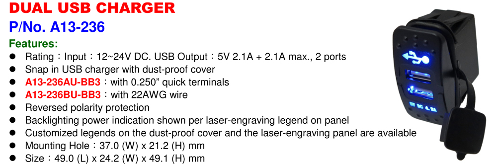 USB разъем двойной 12-24B 2,1A+2,1A А13-236АU (с синей подсветкой) SCI (Тайвань)