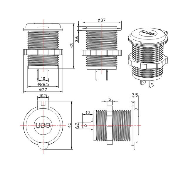 USB разъем двойной 2.1А+2.1А с красной подсветкой А53R