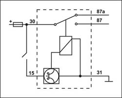 Реле работают по однопроводной схеме, в которой с корпусом автомобиля соединен отрицательный вывод источника питания, и работают только при поданном напряжении.