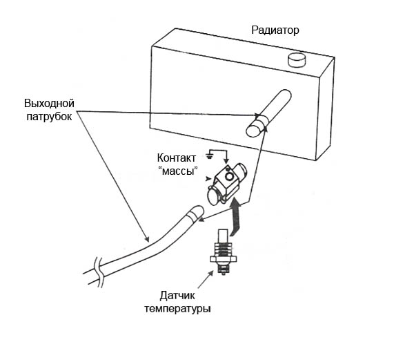 Врезается в шланг системы охлаждения и фиксируется при помощи двух хомутов. Датчик температуры вкручивается в переходник.