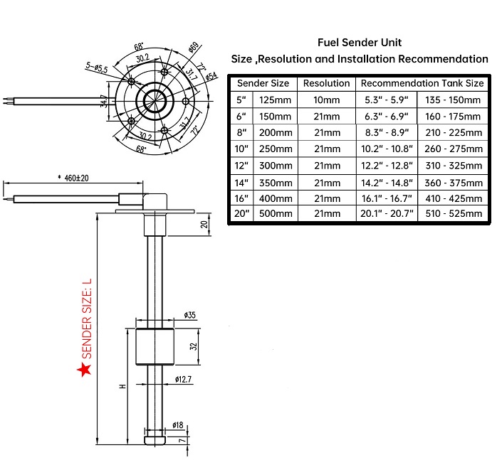 Длина датчика = топливный бак/высота резервуара для воды-10 мм