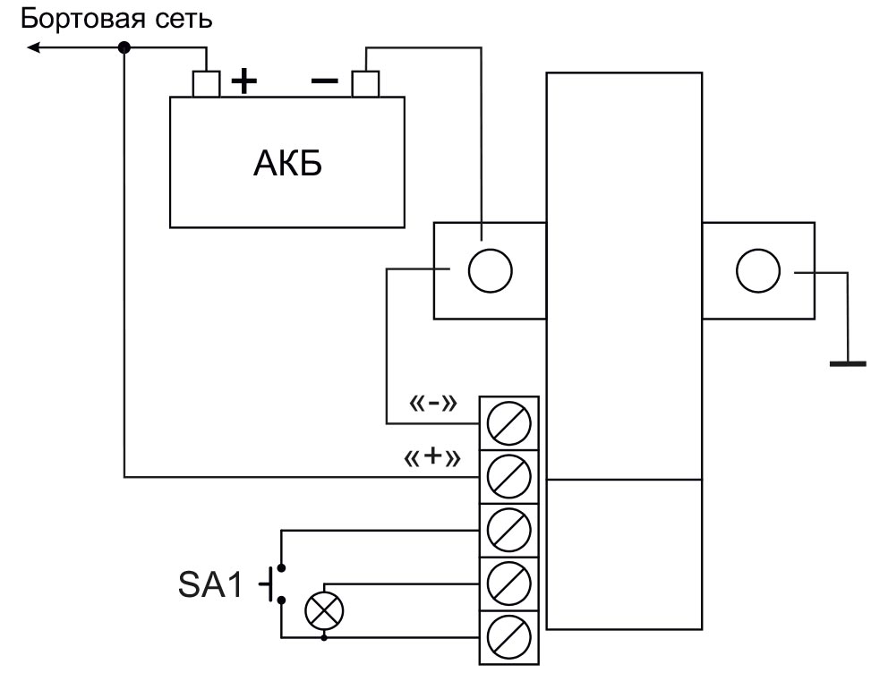Включение и выключение реле осуществляется кнопкой с фиксацией и подсветкой (выключателем), в комплект не входит.