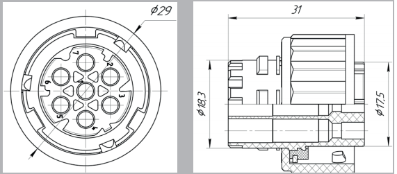 Соединитель электрический цилиндрический разъёмный, с фиксацией сочленённого положения накидной гайкой байонетного типа, защищённого исполнения, типа СЦБ, предназначен для использования в изделиях автотракторного электрооборудования для монтажа жгута проводов с медными жилами сечением от 0,5мм² до 2,5мм²