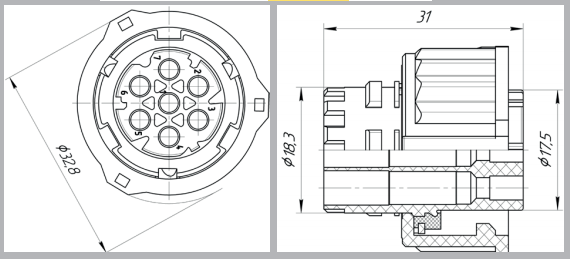 Соединитель электрический цилиндрический разъёмный, с фиксацией сочленённого положения накидной гайкой байонетного типа, защищённого исполнения, типа СЦБ, предназначен для использования в изделиях автотракторного электрооборудования для монтажа жгута проводов с медными жилами сечением от 0,5мм² до 2,5мм²