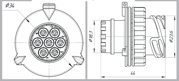 Соединитель электрический цилиндрический разъёмный, с фиксацией сочленённого положения накидной гайкой байонетного типа, защищённого исполнения, типа СЦБ, предназначен для использования в изделиях автотракторного электрооборудования для монтажа жгута проводов с медными жилами сечением от 0,5мм² до 2,5мм²