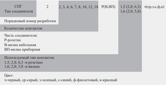 Соединителям присвоено условное обозначение, которое состоит из следующих классификационных признаков: