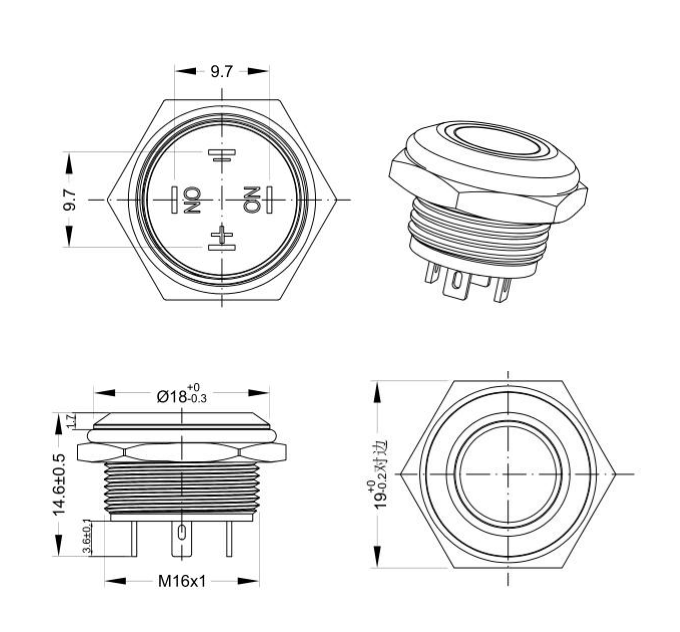 Кнопка (без фиксации) PX16CM-P10Y/EB12V/S с синей подсветкой