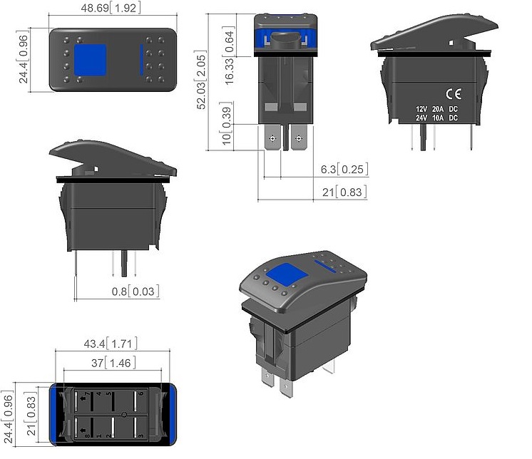 Переключатель 12-24В, SF50713-7-4P-A6BB (ON)-OFF с синей подсветкой