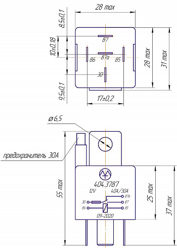 Реле 404.3787 12В 40/30А 5-ти контактное с предохранителем (Энергомаш)