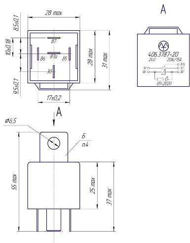 Реле 406.3787-20 24В 20А/15А со светодиодом 5-ти контактное (Энергомаш)